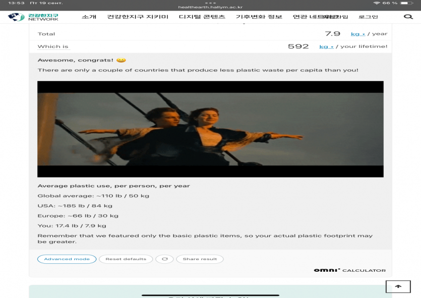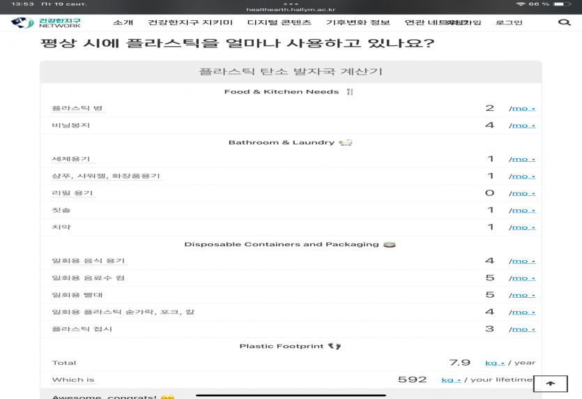 This month, I measured my plastic footprint using the Health Earth Network calculator. The result showed that I use about 7.9 kg of plastic per year, which is much lower than the global average of 50 kg. This was encouraging, but I also realized that I still rely on disposable items more than I should. Most of my plastic use comes from disposable food containers (4/month) and drink cups (5/month), as well as straws and utensils. To reduce this, I started using my own tumbler at cafés and plan to carry a reusable cutlery set. I also noticed that I use 2 plastic bottles and 4 plastic bags each month, so I bring an eco-bag when shopping and want to switch to a reusable water bottle. In the bathroom, my usage is smaller but regular, such as shampoo bottles, a toothbrush, and toothpaste. Over time, these add up, so I want to try eco-friendly options like bamboo toothbrushes or refill containers.